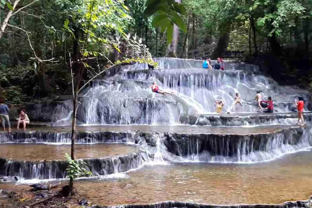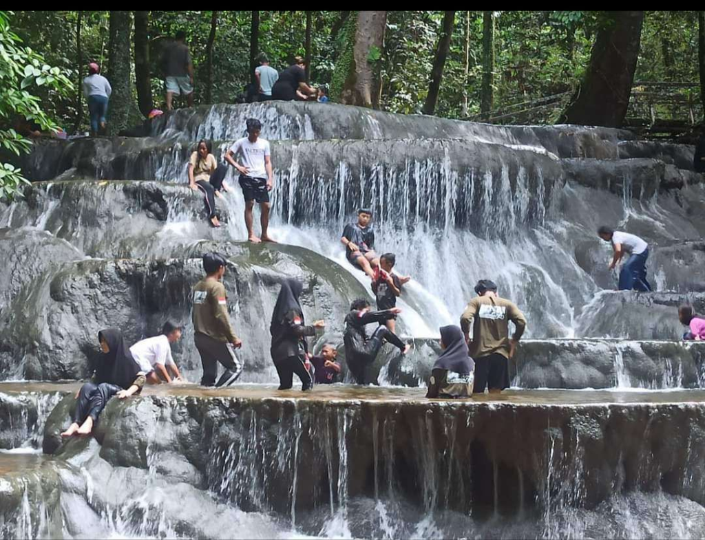 Yang membuat Air Terjun Semolon cepat melekat di ingatan adalah bentuknya. Jika banyak air terjun tampil dengan jatuhan lurus yang dramatis, Air Terjun Semolon justru menarik karena teras teras batunya yang lebar dan berlapis. Air turun dari satu tingkat ke tingkat lain dengan ritme yang tenang, lalu membentuk kolam alami yang terlihat sangat menggoda untuk dirasakan langsung. Foto foto yang beredar pun memperlihatkan identitas visual yang sangat kuat, yaitu air terjun bertangga di tengah rimbun hutan tropis.