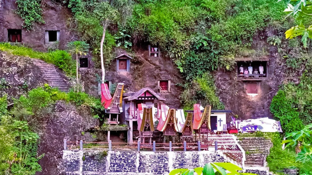 | 3 | Pemakaman adat | Gua batu, tebing pemakaman, tau tau, dan peti kayu menunjukkan cara masyarakat Toraja menjaga hubungan dengan leluhur. |