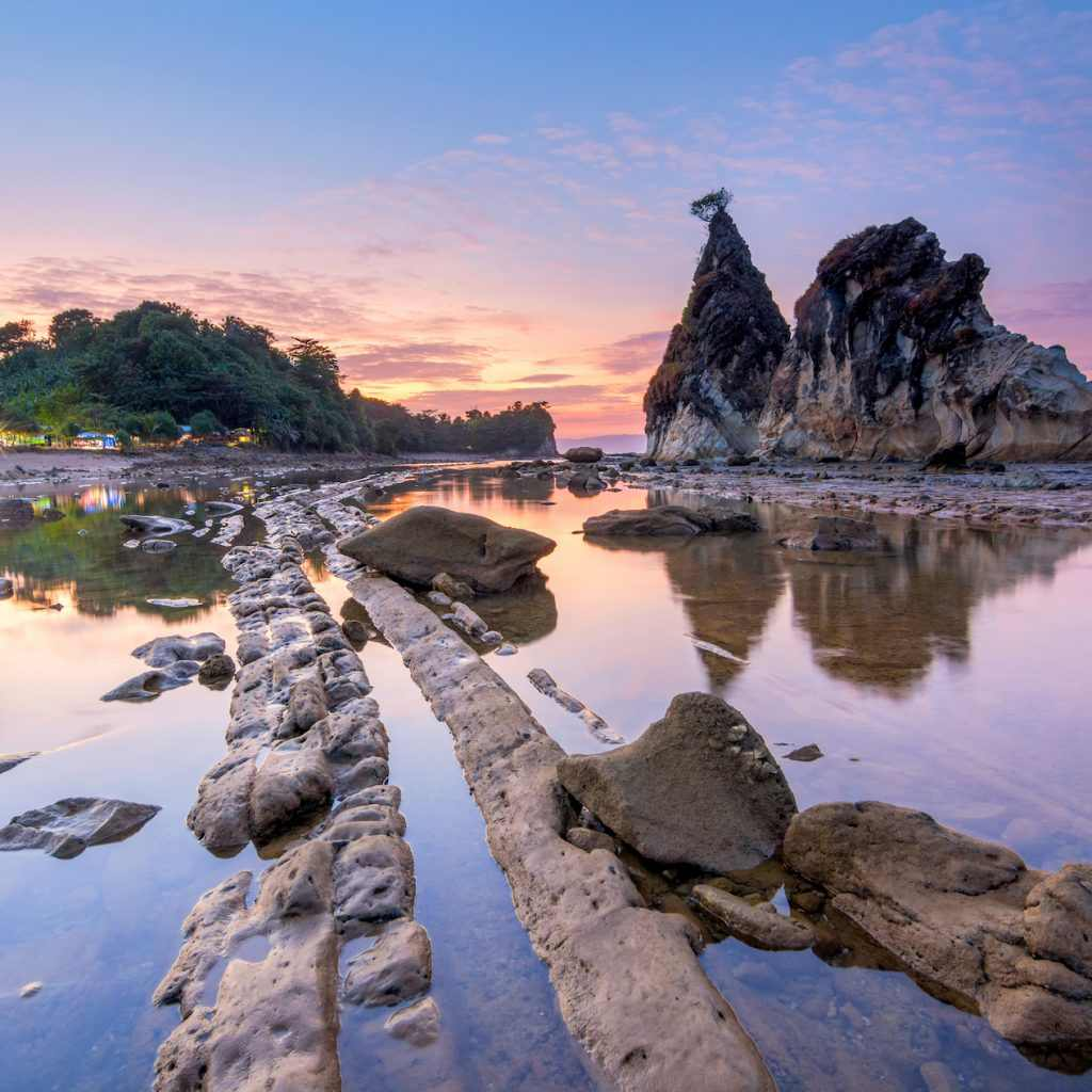 Sawarna punya ikon yang jelas. Dua karang raksasa di Tanjung Layar menjadi wajah utama destinasi ini dan membedakannya dari pantai lain di Banten.