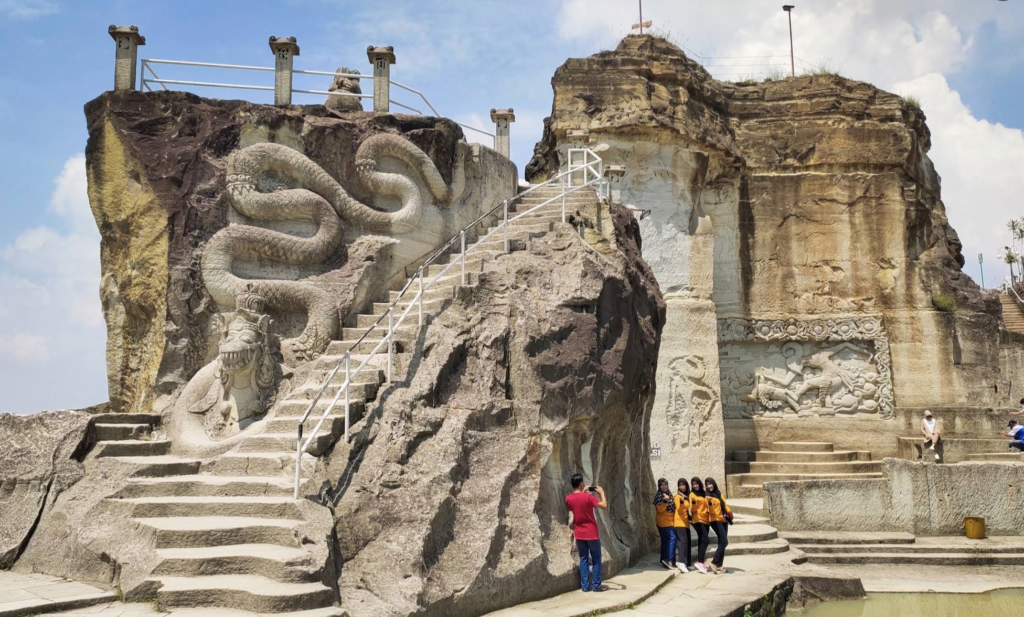 Yang menarik, pesona tebing ini tidak berhenti pada bentuk alami batuannya. Di beberapa sisi, pengunjung bisa menemukan pahatan dan relief yang memperkuat kesan visual kawasan. Relief wayang dan ukiran artistik di sisi tebing memberi sentuhan budaya yang membuat tempat ini terasa lebih hidup dan punya identitas lokal yang kuat.